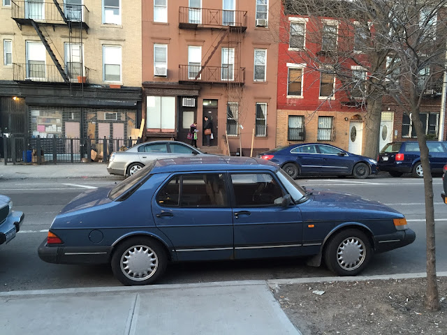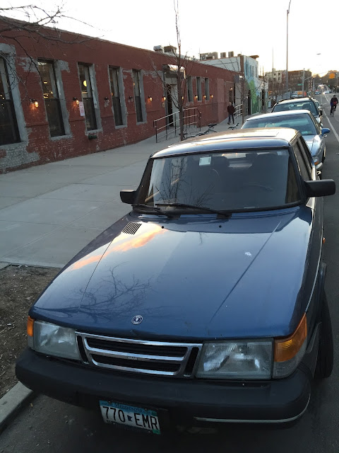 This is a 1993 Saab 900S in Nocturne Blue Poly. I found a list of the original paint color codes for Saabs of this era and the names read like a J Crew catalogue; Eucalyptus Green, Derby Gray, and Imola Red to name a few.