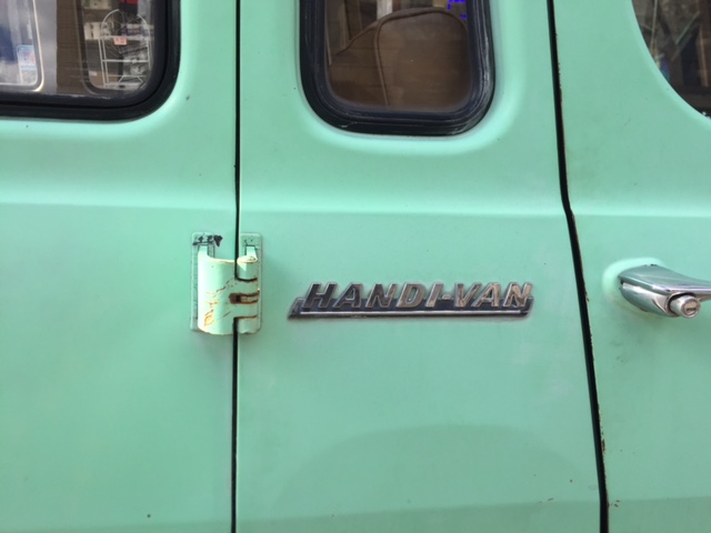 Leaning forward in all caps HANDI-VAN is up to the task! The door handles are lovely '60s style.